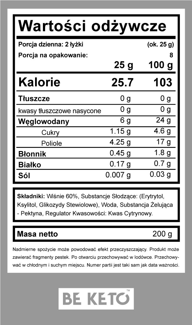 Keto Dżem™ Doskonale Wiśniowy to jedyny w swoim rodzaju wiśniowy keto dżem, który oczaruje Twoje podniebienie. Stworzony z miłością i największą starannością z wyselekcjonowanych, dojrzałych wiśni. Keto Dżem dedykowany jest osobom będącym na diecie ketogenicznej, niskowęglowodanowej oraz wszystkim tym, którzy chcą wyeliminować cukier ze swojej codziennej diety. Delektuj się łyżką keto dżemu, gdy tylko masz ochotę, ale pamiętaj – nie przekraczaj 1/3 słoika dziennie!