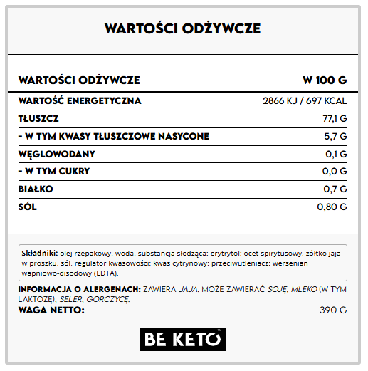 Keto Majonez świetnie komponuje się z mięsem, rybami, warzywami i jajkami. Użyj go do sałatek, burgerów, kanapek lub jako bazy do domowych dipów i sosów. Dzięki dużemu opakowaniu 390g, wystarczy na wiele keto posiłków dla całej rodziny.